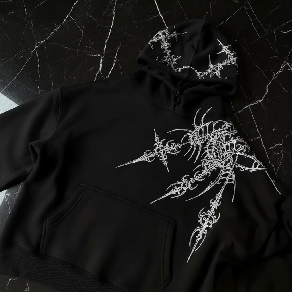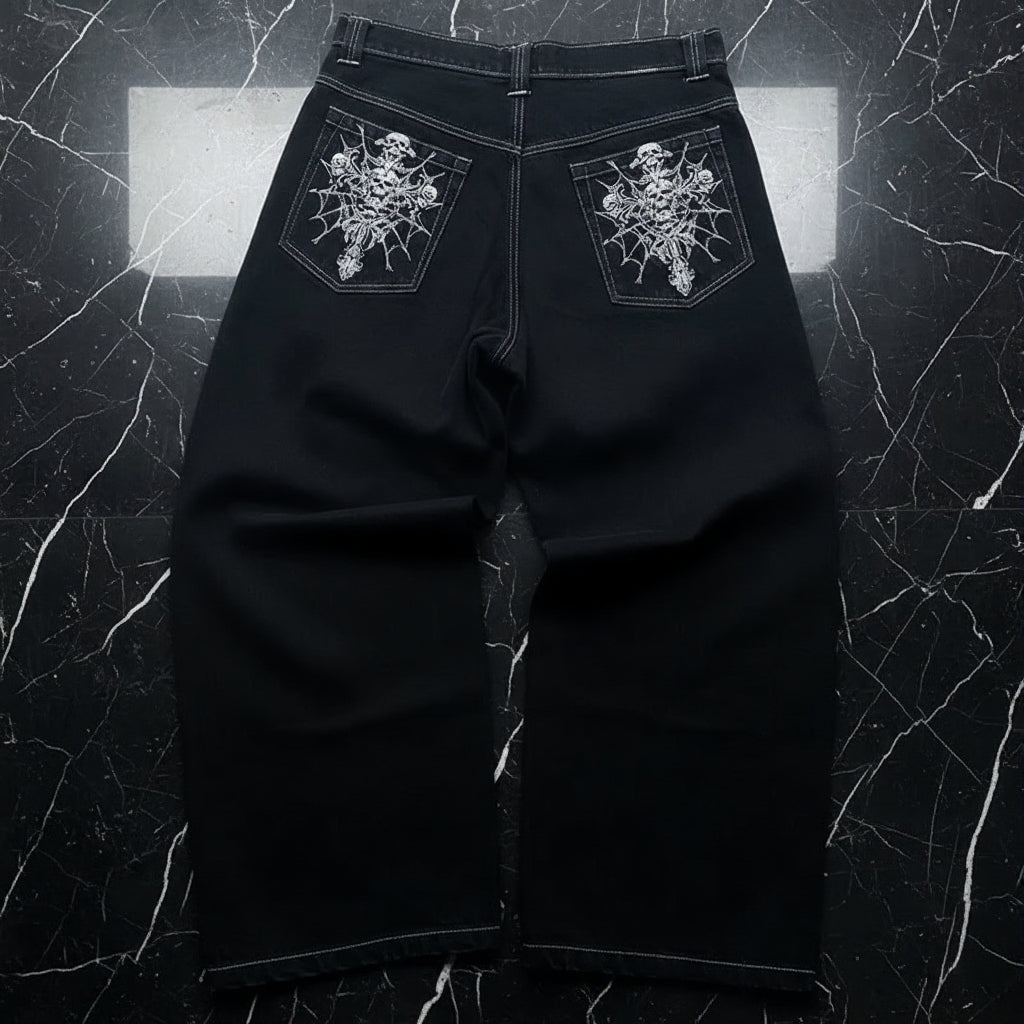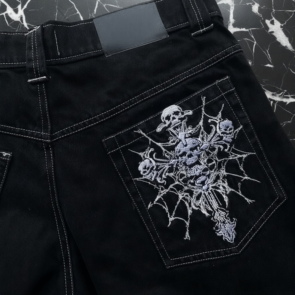 The embroidery is INSANE - intricate white threadwork on pure black that photographs like crazy for fit pics. The hoodie has graphics on the back, front, AND sleeves. The jeans have matching pocket embroidery. Even the gloves have details. This is the kind of coordination that makes people think you actually know what you're doing with fashion.