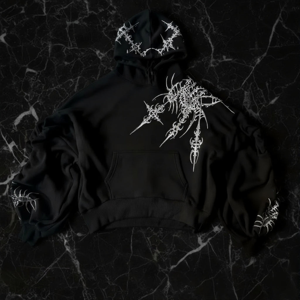 This is the outfit that makes people move out of your way in the hallway. Not because you're intimidating (well, maybe a little), but because the fit is so clean they're lowkey studying it. The embroidery goes crazy - like someone took actual occult manuscripts and turned them into wearable art. This isn't your older brother's Hot Topic phase, this is elevated dark aesthetic that actually hits.